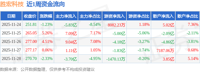 资金流向数据方面,本周胜宏科技主力资金合计净流入7.71亿元,游资资金合计净流出10.34亿元,散户资金合计净流入2.64亿元。本周资金流向一览见下表: