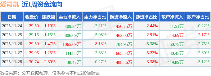 资金流向数据方面,本周爱司凯主力资金合计净流出523.59万元,游资资金合计净流入1361.51万元,散户资金合计净流出837.91万元。本周资金流向一览见下表: