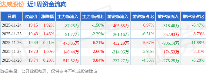 资金流向数据方面,本周达威股份主力资金合计净流入947.78万元,游资资金合计净流入24.55万元,散户资金合计净流出972.33万元。本周资金流向一览见下表: