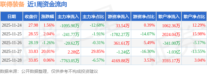 资金流向数据方面,本周联得装备主力资金合计净流入1.36亿元,游资资金合计净流出9646.42万元,散户资金合计净流出3991.65万元。本周资金流向一览见下表: