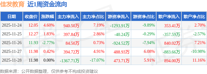 资金流向数据方面,本周佳发教育主力资金合计净流入449.85万元,游资资金合计净流出1296.02万元,散户资金合计净流入846.18万元。本周资金流向一览见下表: