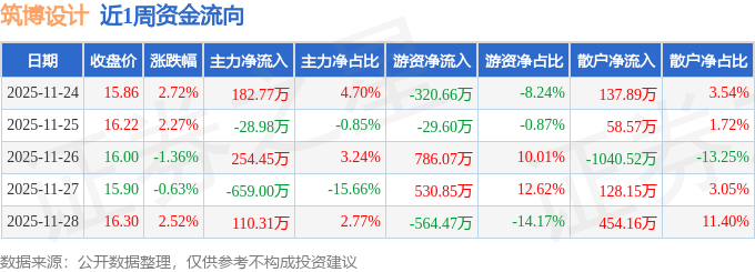 资金流向数据方面,本周筑博设计主力资金合计净流出140.45万元,游资资金合计净流入402.18万元,散户资金合计净流出261.74万元。本周资金流向一览见下表: