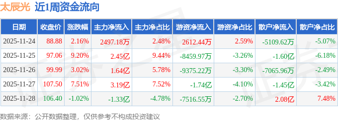 资金流向数据方面,本周太辰光主力资金合计净流入6.2亿元,游资资金合计净流出4.01亿元,散户资金合计净流出2.19亿元。本周资金流向一览见下表: