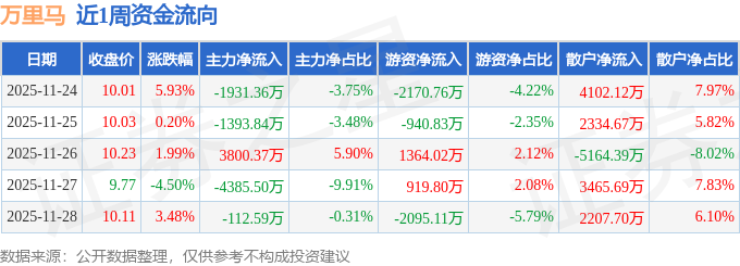 资金流向数据方面,本周万里马主力资金合计净流出4022.92万元,游资资金合计净流出2922.87万元,散户资金合计净流入6945.79万元。本周资金流向一览见下表:
