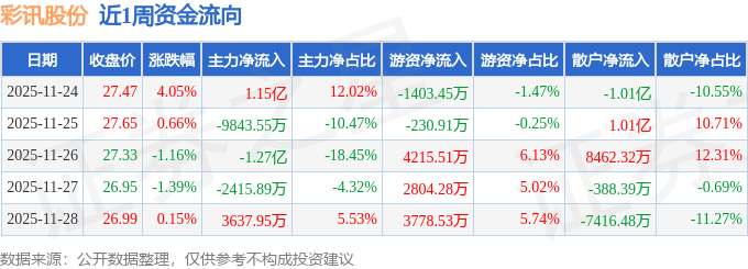 沪深股通持股方面,截止2025年11月28日收盘,彩讯股份深股通持股数为284.15万股,占流通股比为66.0%。