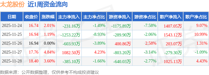 资金流向数据方面,本周太龙股份主力资金合计净流出1390.92万元,游资资金合计净流出2508.17万元,散户资金合计净流入3899.08万元。本周资金流向一览见下表: