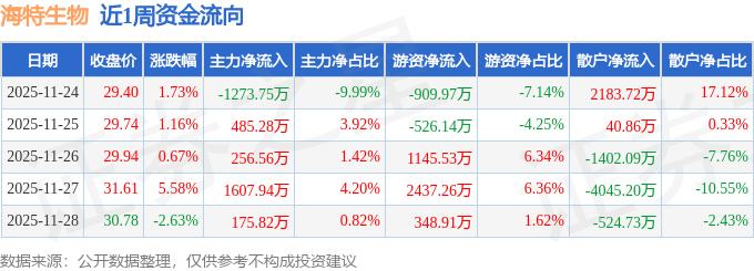 资金流向数据方面,本周海特生物主力资金合计净流入1251.85万元,游资资金合计净流入2495.59万元,散户资金合计净流出3747.44万元。本周资金流向一览见下表: