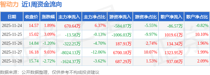 资金流向数据方面,本周智动力主力资金合计净流出9313.69万元,游资资金合计净流入5985.28万元,散户资金合计净流入3328.41万元。本周资金流向一览见下表: