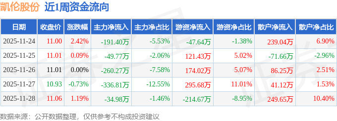 资金流向数据方面,本周凯伦股份主力资金合计净流出873.22万元,游资资金合计净流入328.82万元,散户资金合计净流入544.4万元。本周资金流向一览见下表:
