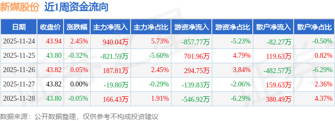资金流向数据方面,本周新媒股份主力资金合计净流入452.9万元,游资资金合计净流出547.81万元,散户资金合计净流入94.92万元。本周资金流向一览见下表: