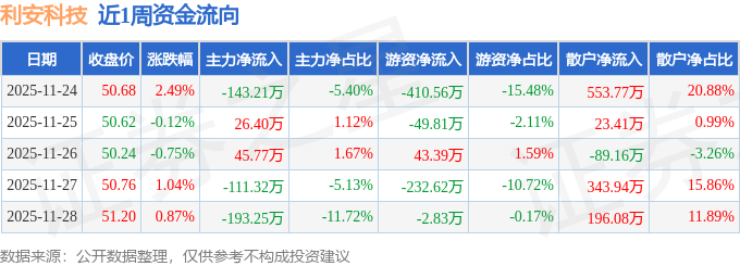 资金流向数据方面,本周利安科技主力资金合计净流出375.62万元,游资资金合计净流出652.42万元,散户资金合计净流入1028.04万元。本周资金流向一览见下表: