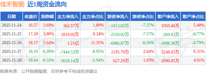 资金流向数据方面,本周佳禾智能主力资金合计净流入4204.11万元,游资资金合计净流出8135.93万元,散户资金合计净流入3931.81万元。本周资金流向一览见下表: