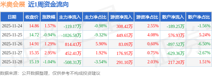 资金流向数据方面,本周米奥会展主力资金合计净流出387.22万元,游资资金合计净流入1309.22万元,散户资金合计净流出922.0万元。本周资金流向一览见下表: