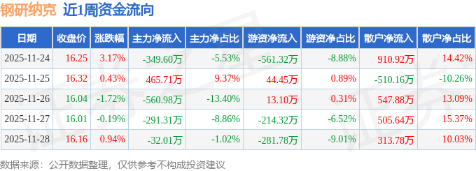 资金流向数据方面,本周钢研纳克主力资金合计净流出768.19万元,游资资金合计净流出999.87万元,散户资金合计净流入1768.06万元。本周资金流向一览见下表: