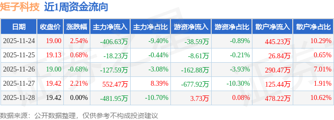 资金流向数据方面,本周矩子科技主力资金合计净流出481.94万元,游资资金合计净流出884.26万元,散户资金合计净流入1366.2万元。本周资金流向一览见下表:
