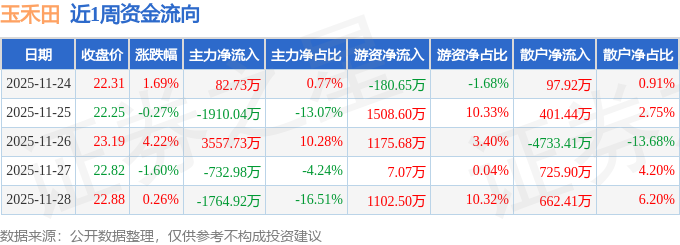 资金流向数据方面,本周玉禾田主力资金合计净流出767.48万元,游资资金合计净流入3613.2万元,散户资金合计净流出2845.72万元。本周资金流向一览见下表: