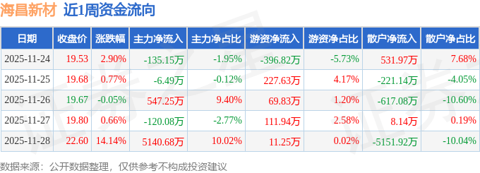 资金流向数据方面,本周海昌新材主力资金合计净流入5426.2万元,游资资金合计净流入23.83万元,散户资金合计净流出5450.03万元。本周资金流向一览见下表: