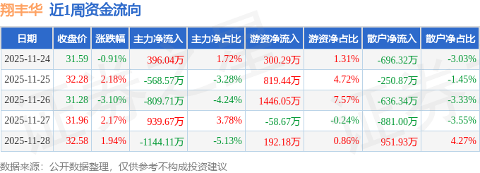资金流向数据方面,本周翔丰华主力资金合计净流出1186.69万元,游资资金合计净流入2699.29万元,散户资金合计净流出1512.61万元。本周资金流向一览见下表: