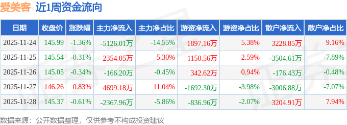 资金流向数据方面,本周爱美客主力资金合计净流出606.94万元,游资资金合计净流入861.1万元,散户资金合计净流出254.16万元。本周资金流向一览见下表: