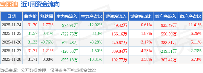 资金流向数据方面,本周宝丽迪主力资金合计净流出3002.85万元,游资资金合计净流入988.85万元,散户资金合计净流入2014.0万元。本周资金流向一览见下表: