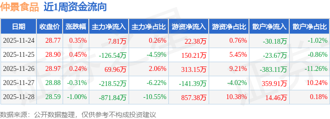 资金流向数据方面,本周仲景食品主力资金合计净流出1139.14万元,游资资金合计净流入1201.73万元,散户资金合计净流出62.59万元。本周资金流向一览见下表: