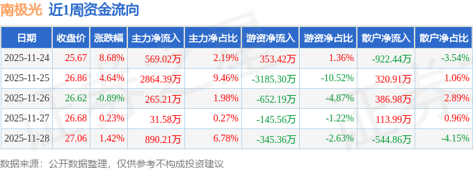 资金流向数据方面,本周南极光主力资金合计净流入4620.4万元,游资资金合计净流出3974.98万元,散户资金合计净流出645.42万元。本周资金流向一览见下表: