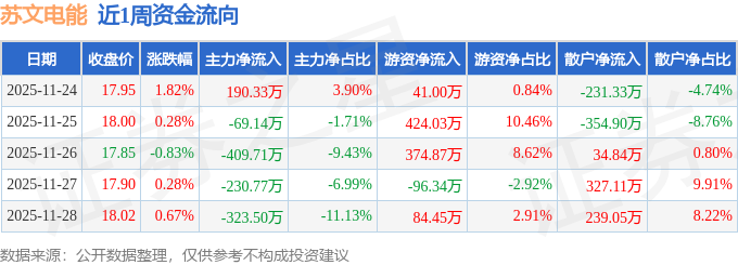 资金流向数据方面,本周苏文电能主力资金合计净流出842.78万元,游资资金合计净流入828.02万元,散户资金合计净流入14.77万元。本周资金流向一览见下表:
