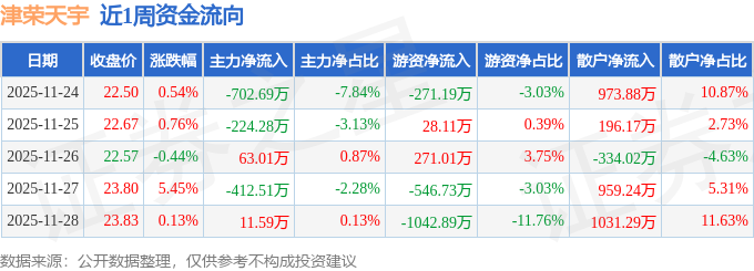 资金流向数据方面,本周津荣天宇主力资金合计净流出1264.88万元,游资资金合计净流出1561.68万元,散户资金合计净流入2826.56万元。本周资金流向一览见下表: