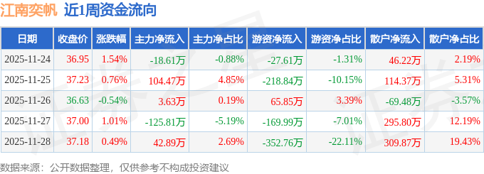 资金流向数据方面,本周江南奕帆主力资金合计净流入6.57万元,游资资金合计净流出703.35万元,散户资金合计净流入696.78万元。本周资金流向一览见下表: