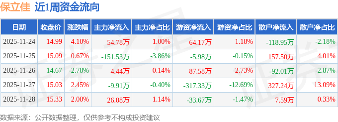 资金流向数据方面,本周保立佳主力资金合计净流出76.15万元,游资资金合计净流出205.23万元,散户资金合计净流入281.37万元。本周资金流向一览见下表:
