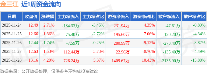 资金流向数据方面,本周金三江主力资金合计净流入571.35万元,游资资金合计净流入2141.17万元,散户资金合计净流出2712.52万元。本周资金流向一览见下表: