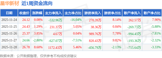 资金流向数据方面,本周星华新材主力资金合计净流入248.44万元,游资资金合计净流入1662.14万元,散户资金合计净流出1910.58万元。本周资金流向一览见下表:
