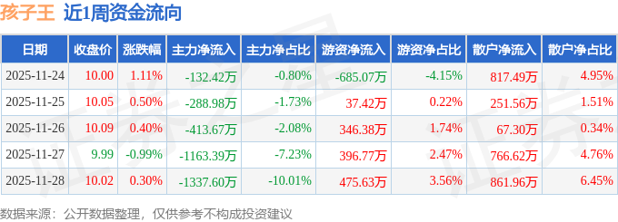 资金流向数据方面,本周孩子王主力资金合计净流出3336.06万元,游资资金合计净流入571.13万元,散户资金合计净流入2764.93万元。本周资金流向一览见下表: