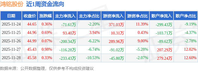资金流向数据方面,本周鸿铭股份主力资金合计净流出528.25万元,游资资金合计净流入534.48万元,散户资金合计净流出6.23万元。本周资金流向一览见下表: