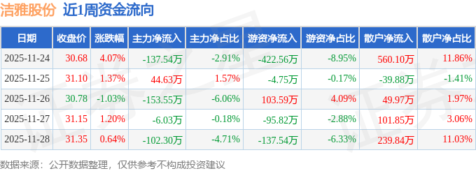 资金流向数据方面,本周洁雅股份主力资金合计净流出354.79万元,游资资金合计净流出557.08万元,散户资金合计净流入911.87万元。本周资金流向一览见下表: