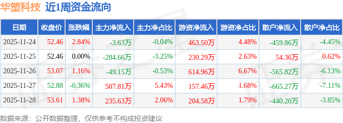 资金流向数据方面,本周华塑科技主力资金合计净流入406.0万元,游资资金合计净流入1670.79万元,散户资金合计净流出2076.79万元。本周资金流向一览见下表: