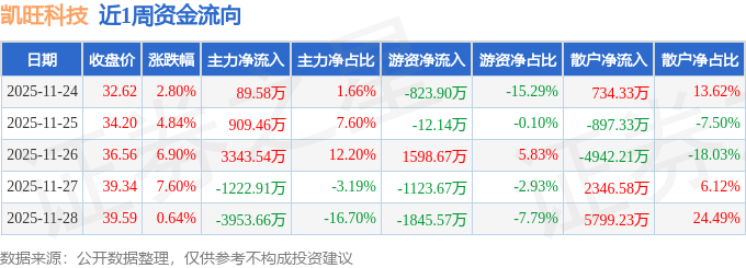 资金流向数据方面,本周凯旺科技主力资金合计净流出833.99万元,游资资金合计净流出2206.61万元,散户资金合计净流入3040.6万元。本周资金流向一览见下表: