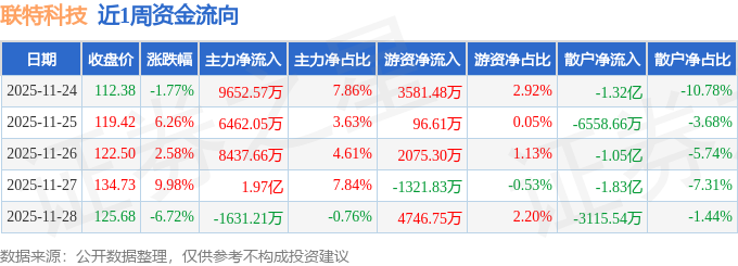资金流向数据方面,本周联特科技主力资金合计净流入4.26亿元,游资资金合计净流入9178.31万元,散户资金合计净流出5.18亿元。本周资金流向一览见下表: