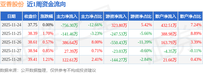资金流向数据方面,本周亚香股份主力资金合计净流出361.12万元,游资资金合计净流出641.47万元,散户资金合计净流入1002.58万元。本周资金流向一览见下表: