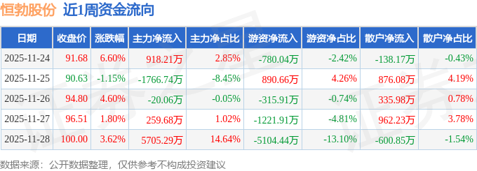 资金流向数据方面,本周恒勃股份主力资金合计净流入5096.38万元,游资资金合计净流出6531.64万元,散户资金合计净流入1435.26万元。本周资金流向一览见下表: