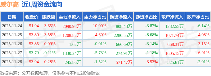 资金流向数据方面,本周威尔高主力资金合计净流入1722.08万元,游资资金合计净流出3459.12万元,散户资金合计净流入1737.04万元。本周资金流向一览见下表: