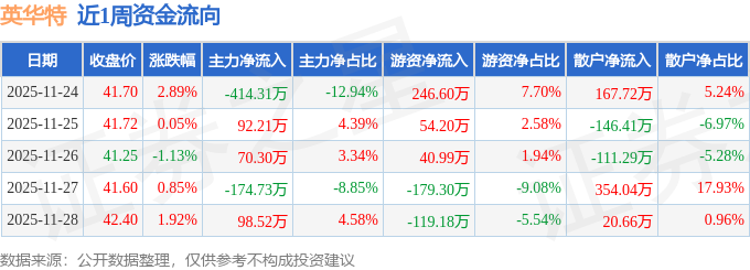 资金流向数据方面,本周英华特主力资金合计净流出328.02万元,游资资金合计净流入43.3万元,散户资金合计净流入284.72万元。本周资金流向一览见下表:
