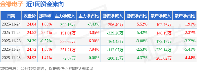 资金流向数据方面,本周金禄电子主力资金合计净流入476.81万元,游资资金合计净流出519.47万元,散户资金合计净流入42.66万元。本周资金流向一览见下表:
