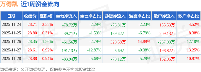资金流向数据方面,本周万得凯主力资金合计净流出455.06万元,游资资金合计净流出1.45万元,散户资金合计净流入456.51万元。本周资金流向一览见下表:
