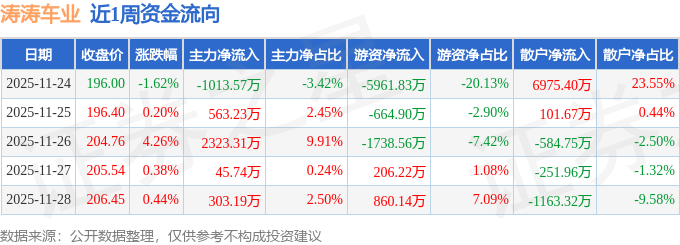 资金流向数据方面,本周涛涛车业主力资金合计净流入2221.89万元,游资资金合计净流出7298.93万元,散户资金合计净流入5077.04万元。本周资金流向一览见下表: