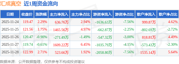 沪深股通持股方面,截止2025年11月28日收盘,汇成真空深股通持股数为32.61万股,占流通股比为153.0%。