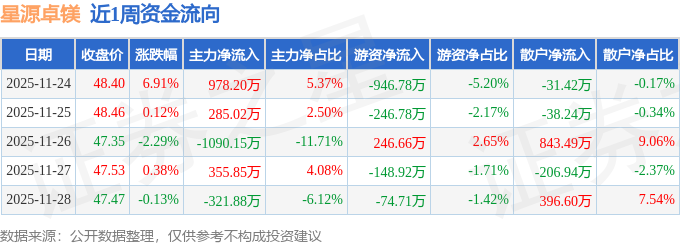 资金流向数据方面,本周星源卓镁主力资金合计净流入207.04万元,游资资金合计净流出1170.53万元,散户资金合计净流入963.49万元。本周资金流向一览见下表: