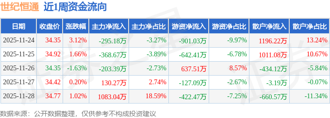 资金流向数据方面,本周世纪恒通主力资金合计净流入346.07万元,游资资金合计净流出1455.49万元,散户资金合计净流入1109.42万元。本周资金流向一览见下表: