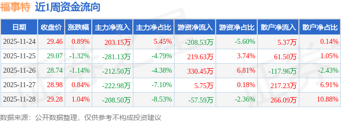 资金流向数据方面,本周福事特主力资金合计净流出721.95万元,游资资金合计净流入289.71万元,散户资金合计净流入432.23万元。本周资金流向一览见下表: