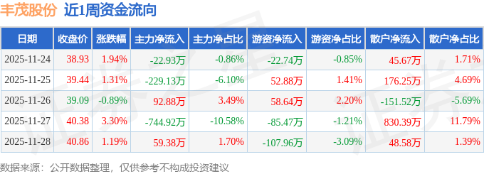 资金流向数据方面,本周丰茂股份主力资金合计净流出844.71万元,游资资金合计净流出104.65万元,散户资金合计净流入949.36万元。本周资金流向一览见下表:
